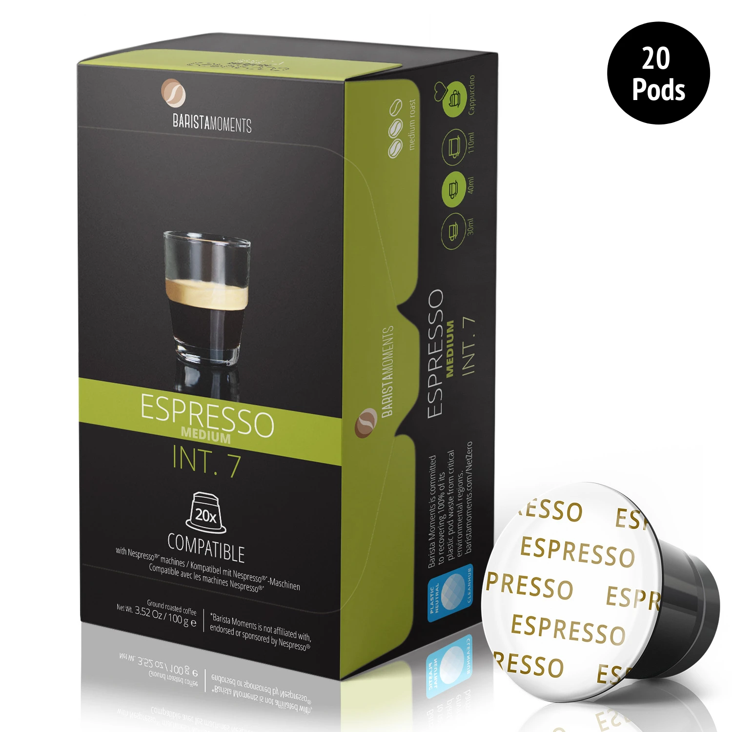 The Barista Moments Espresso Medium Capsules have been crafted to make the perfect Americano! The Barista Moments pods are made with BPA Free food grade plastic, and our Espressos always contain zero preservatives. Quantity Per Box 20 capsules Intensity: 7 Compatibility Our Capsules work in Nespresso Original machines ONLY (formerly: OriginalLine) Barista Moments Capsules do NOT fit in Nespresso Vertuo machines (formerly: VertuoLine), Dolce Gusto, Keurig, nor other systems.