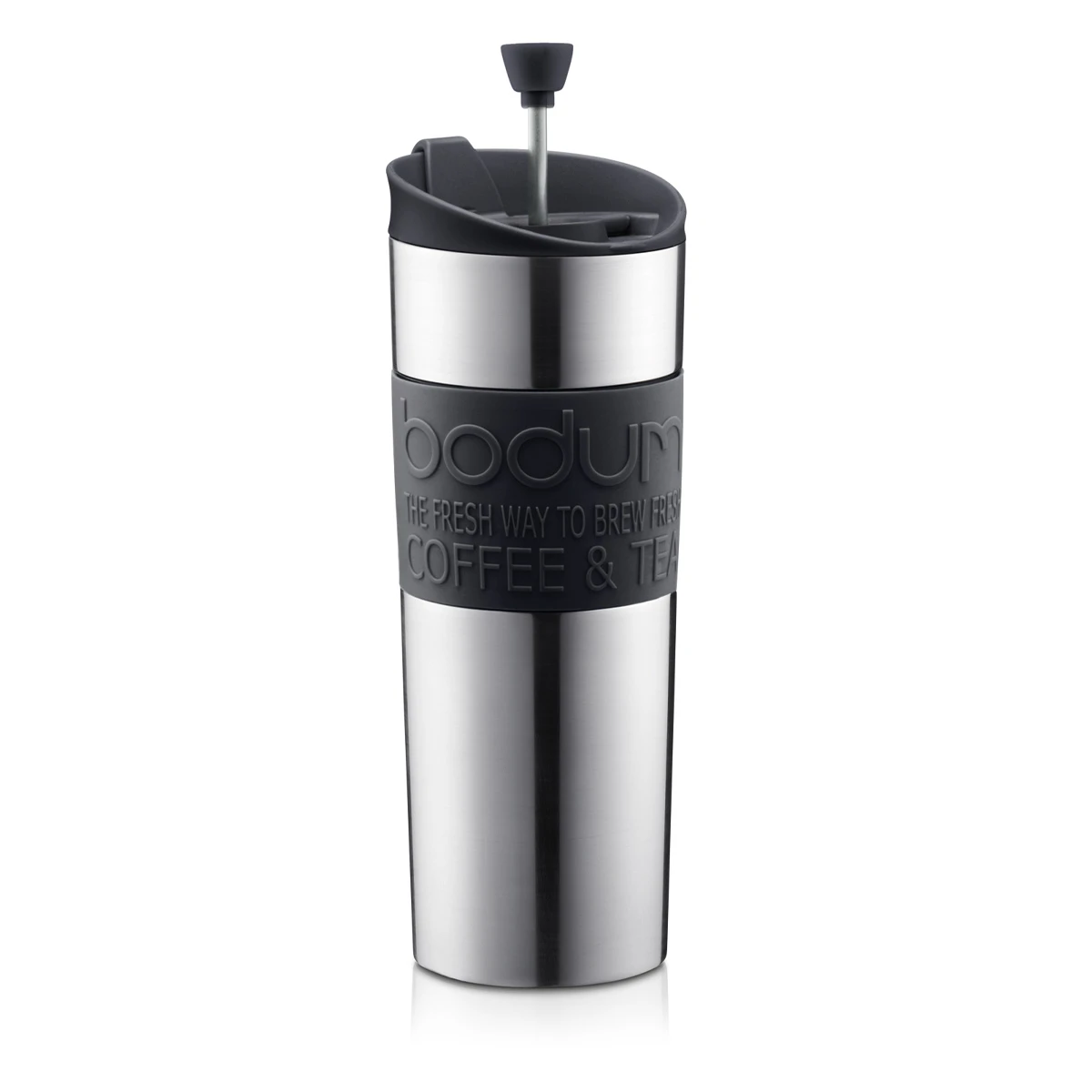 About the Travel Press – Portable Coffee Maker Enjoy your favorite coffee anywhere, anytime, courtesy of the Bodum Travel French Press. This portable coffee maker combines the benefits of a French press brewing system with an insulated travel flask in one handy gadget. Crafted from easy-to-clean stainless steel for durability, this portable coffee maker takes the place of a traditional 3-cup French press. Its double-wall construction keeps your coffee hotter for longer and there’s a colorful Bodum silicone band for safe and ergonomic grip. It’s also highly versatile. You can brew coffee on the go, or fill up from a larger pot you’ve brewed at home. You can even use it to brew loose-leaf tea! So it’s perfect for taking on the train for your morning commute or popping in your rucksack when you go camping. Caution: Make sure the Bodum Travel French Press stays upright when full. The lid is spill-resistant, but it’s not leakproof due to possible over pressure. Main Features & Benefits Travel French press coffee maker, ideal for enjoying your favorite cup of coffee on the go. Silicone and mesh filter reduces sediment in your coffee. Double wall, vacuum-insulated mug made of stainless steel that keeps coffee hotter for longer while remaining cool to the touch. Wrapped in a non-slip silicone band for easy grip and comfortable hold. Non-skid rubber base. Can also be used with loose-leaf tea. Available in a choice of colors to suit any style. How it Works Place the Bodum Travel French Press on a stable, non-slip surface and remove the plunger lid. Add coarse ground coffee into the press – we recommend 1 tbsp for each 0.1l of water. Boil hot water, wait 30 seconds, then pour into the travel press to approx. 1in/30cm from the top. Stir and close the spout. Let the coffee brew for four minutes. Hold the travel press firmly and carefully depress the plunger. Add milk and sugar to your personal taste, and your coffee is ready to enjoy. Use & Care Drink directly from the travel press or pour into a cup. Clean after each use. All parts dishwasher safe (except for the travel mug with cork).