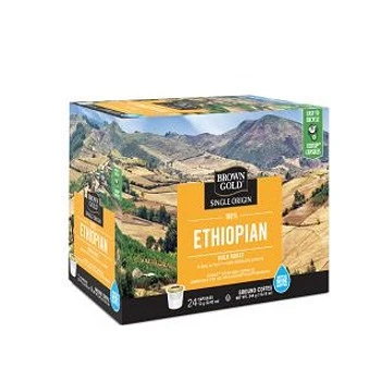 Brown Gold™ has gone to the birthplace of coffee, Ethiopia, to bring you the taste of how coffee was meant to be. This special Ethiopian roast brings out the innermost flavors of these locally farmed coffee beans. Ethiopia is thought by many, many historians as being the place where the shepherd noticed his goats munching on strange berries and then frolicking with renewed energy. He took some of the “berries” back to the village and the rest, as they say, is history! Brown Gold™ 100% Ethiopian coffee is famous for its wonderfully unique, one of a kind floral aroma. This roast has exquisite citrus undertones combined with ever so delicate green tea notes. 100% single origin Ethiopian coffee. 0% compromised by other sourced coffee. Brown Gold™ 100% Ethiopian RealCups comes in convenient single-serve coffee capsules that are compatible for use with Keurig K-cup Coffee brewers (Excluding The Vue). Brown Gold™ and RealCup™ have no affiliation with Keurig® Incorporated or K-Cup®.