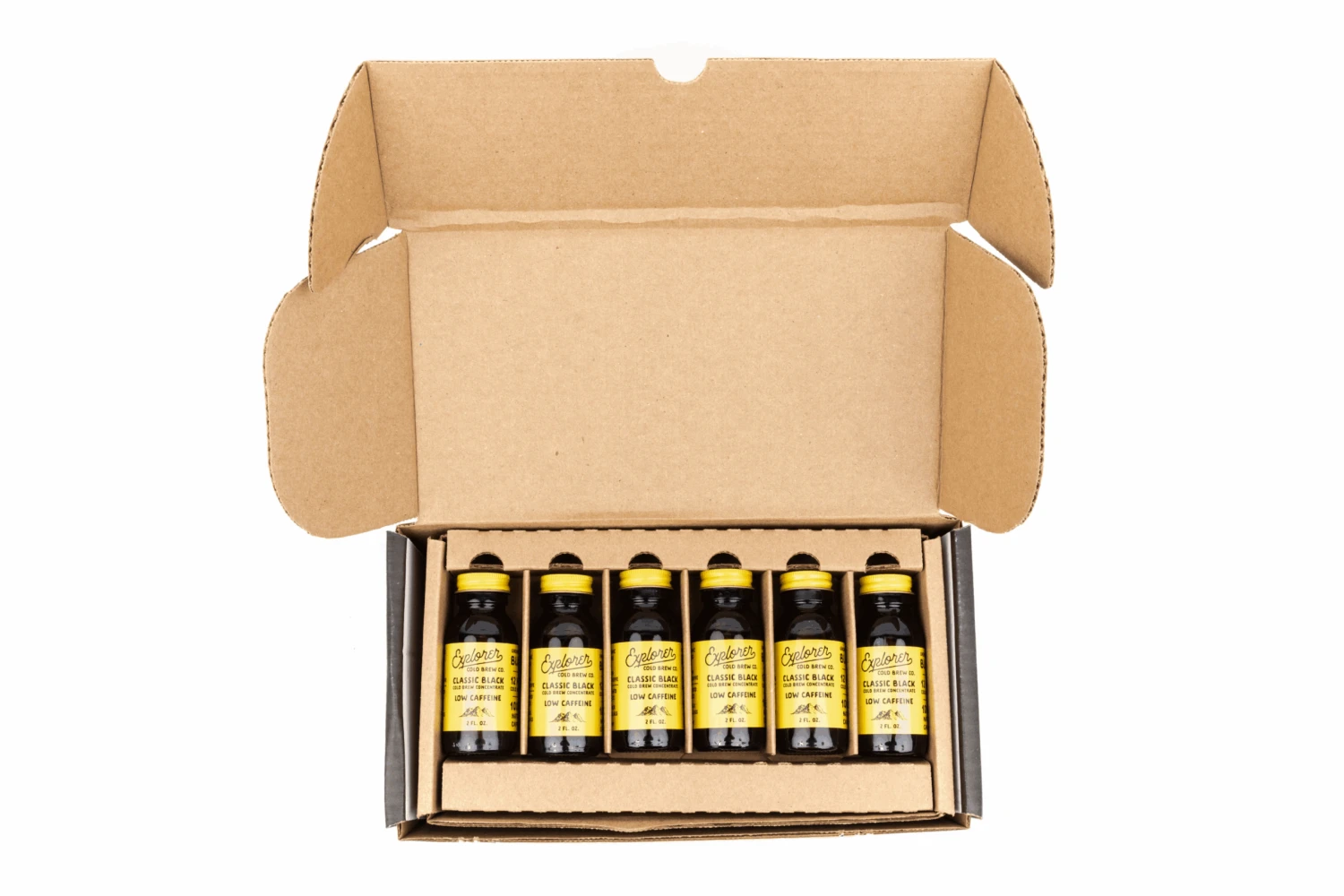 Explorer is your coffee shop in a bottle – make your St*rbucks at home!It’s your new favorite coffee for home or on the go, with four caffeine levels so you can make the coffee that suits your needs. Crafted by 3 award-winning Tastemakers, Explorer’s 4 caffeine levels are all made from organic, fair-trade, and specialty-grade coffee. And it’s super concentrated so you can make it any way you want. Customize your caffeine levels with this box: choose from 10 different options and get the mix of caffeine levels perfect for you. Each box comes with 12 2oz bottles. That’s 12-16 gourmet coffees, without leaving your kitchen. (Who needs St*rbucks anymore when you have Explorer!)Go get your new favorite adventure fuel. Be an Explorer and try something new…just don’t settle for sub-par coffee. What are you waiting for?Caffeine Levels:No Caf: Swiss Water Decaf 99.9% Caffeine Free (0-2mg/oz)Low Caf: Swiss Water Half-Caf (50mg/oz)Reg Caf: Single Origin Arabica (100mg/oz)Extra Caf: Single Origin Arabica with organic caffeine from green coffee (150mg/oz)SWISS WATER® and SWISS WATER® Logo are trademarks of Swiss Water Decaffeinated Coffee Inc. used under license.