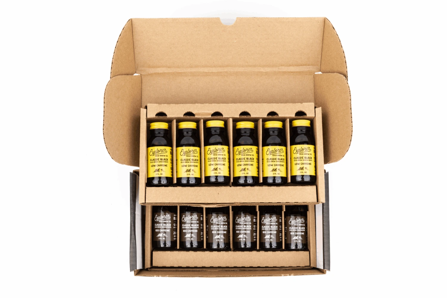 Explorer is your coffee shop in a bottle – make your St*rbucks at home!It’s your new favorite coffee for home or on the go, with four caffeine levels so you can make the coffee that suits your needs. Crafted by 3 award-winning Tastemakers, Explorer’s 4 caffeine levels are all made from organic, fair-trade, and specialty-grade coffee. And it’s super concentrated so you can make it any way you want. Customize your caffeine levels with this box: choose from 10 different options and get the mix of caffeine levels perfect for you. Each box comes with 12 2oz bottles. That’s 12-16 gourmet coffees, without leaving your kitchen. (Who needs St*rbucks anymore when you have Explorer!)Go get your new favorite adventure fuel. Be an Explorer and try something new…just don’t settle for sub-par coffee. What are you waiting for?Caffeine Levels:No Caf: Swiss Water Decaf 99.9% Caffeine Free (0-2mg/oz)Low Caf: Swiss Water Half-Caf (50mg/oz)Reg Caf: Single Origin Arabica (100mg/oz)Extra Caf: Single Origin Arabica with organic caffeine from green coffee (150mg/oz)SWISS WATER® and SWISS WATER® Logo are trademarks of Swiss Water Decaffeinated Coffee Inc. used under license.