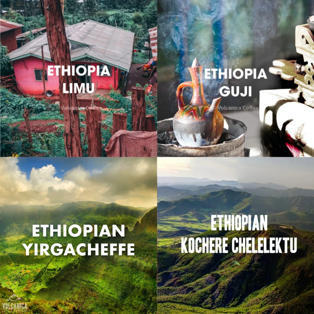 Ethiopian Coffee Gift Box: Explore the flavors of Ethiopian Coffee all in one beautifully packaged gift offering. This single origin gift box contains four coffees that immerse all of the rich flavors of the African country. This gift box includes a 16 oz bag each of the following coffees: Ethiopian Limu Coffee Ethiopian Guji Coffee Ethiopian Yirgacheffe Ethiopian Kochere Chelelektu Coffee