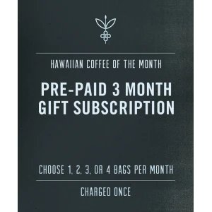 In this pre – paid 3 – month Hawaiian coffee club gift subscription, your special someone will receive new, fresh – roasted Hawaiian coffee each month. After 3 months, the subscription will automatically end. Your Hawaiian coffee subscription might include Kona coffee, Ka’u coffee, Maui coffee, Hamakua, Puna, Geisha, peaberries, etc. Members receive exclusive Hawaiian coffee offerings and the first option to buy limited releases. Members receive special offers each month before your coffee subscription ships Each bag is 10 oz. Includes year – round free shipping. Please note: All club shipments are roasted and shipped before the first week of each month, and your account will be charged between the 26th – 28th. New members that sign up on or before the 26th of the month at 9 PM HST will receive their first shipment ‘on – cycle’, meaning within the first week of the next month. New members that sign up after the 26th will have their order held until the next club cycle. If you need coffee immediately, please place a separate order because all items ordered with the club will ship at the same time. Example of the order cycle for new members: If you place your first order on January 25th, you’ll receive your first shipment between Feb 1 – 7. If you place your first order on January 27th, you’ll receive your first shipment between March 1 – 7. | Pre – paid 3 Month Hawaiian Coffee Gift Subscription | 1 bag | month | Light to Medium Roast | whole bean | Big Island Coffee Roasters