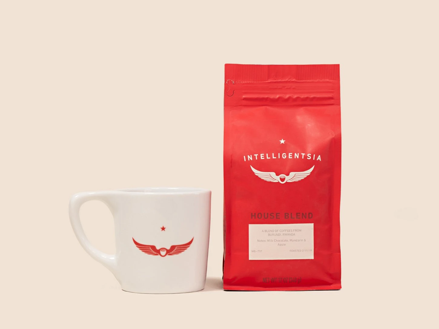 Illuminate your coffee experience with two Intelligentsia staples. This bundle features our simple and sleek Red Wings Filter Mug and a 12oz bag of our House Blend. Perfect for any coffee lover on your list. Please note, coffee available as whole bean only.